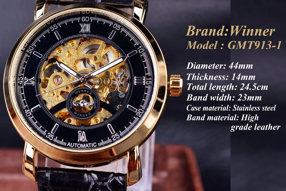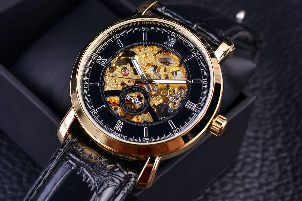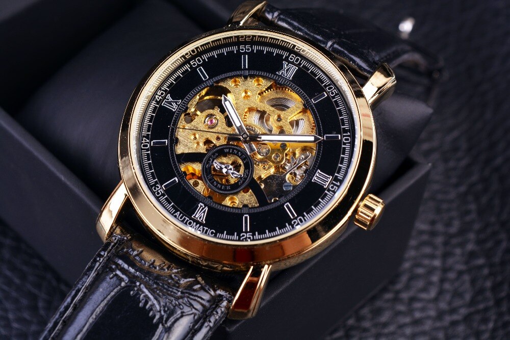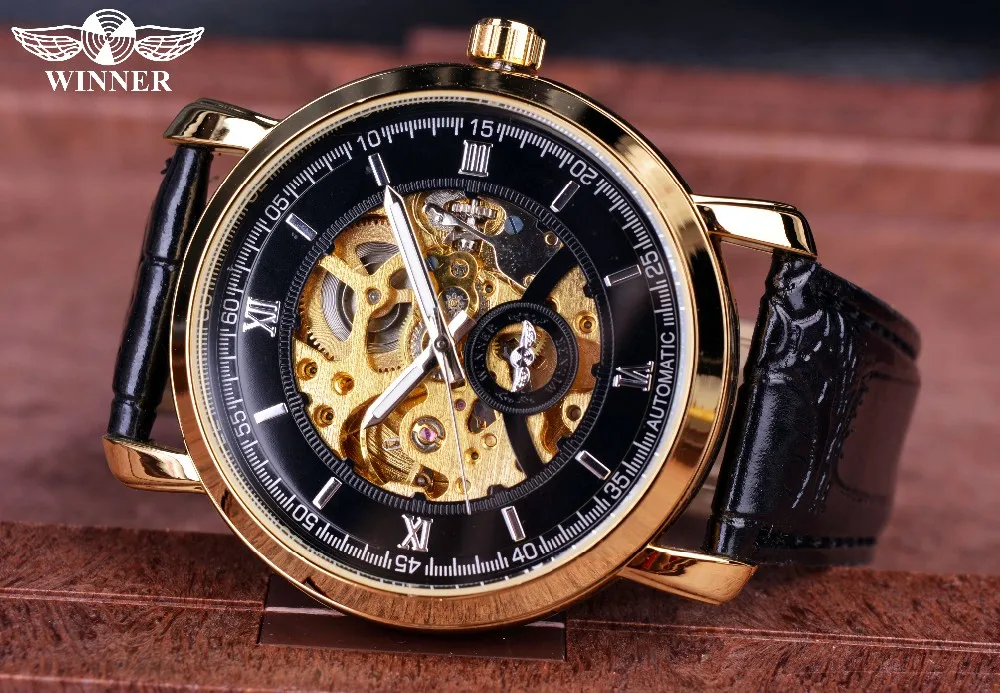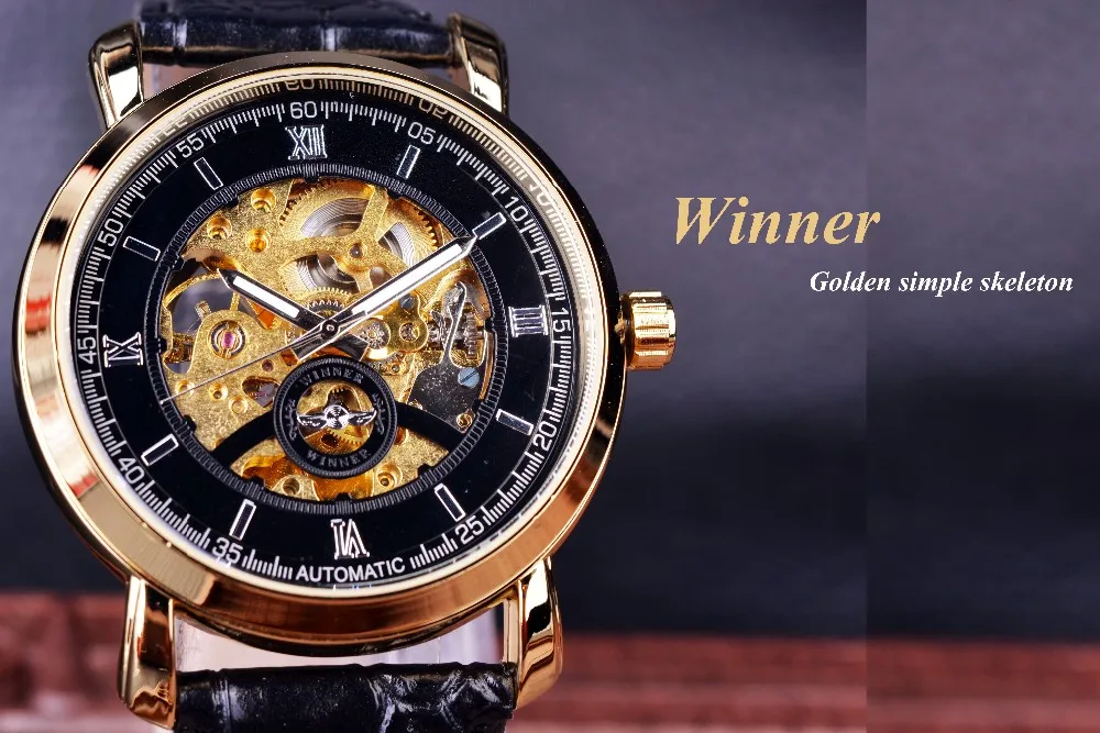 Winnaar Golden Bezel Zwarte Wijzerplaat Jurk Mannen Horloges Topmerk Luxe Automatische Horloge Mechanische Skeleton Mannen Horloges Klok Mannen